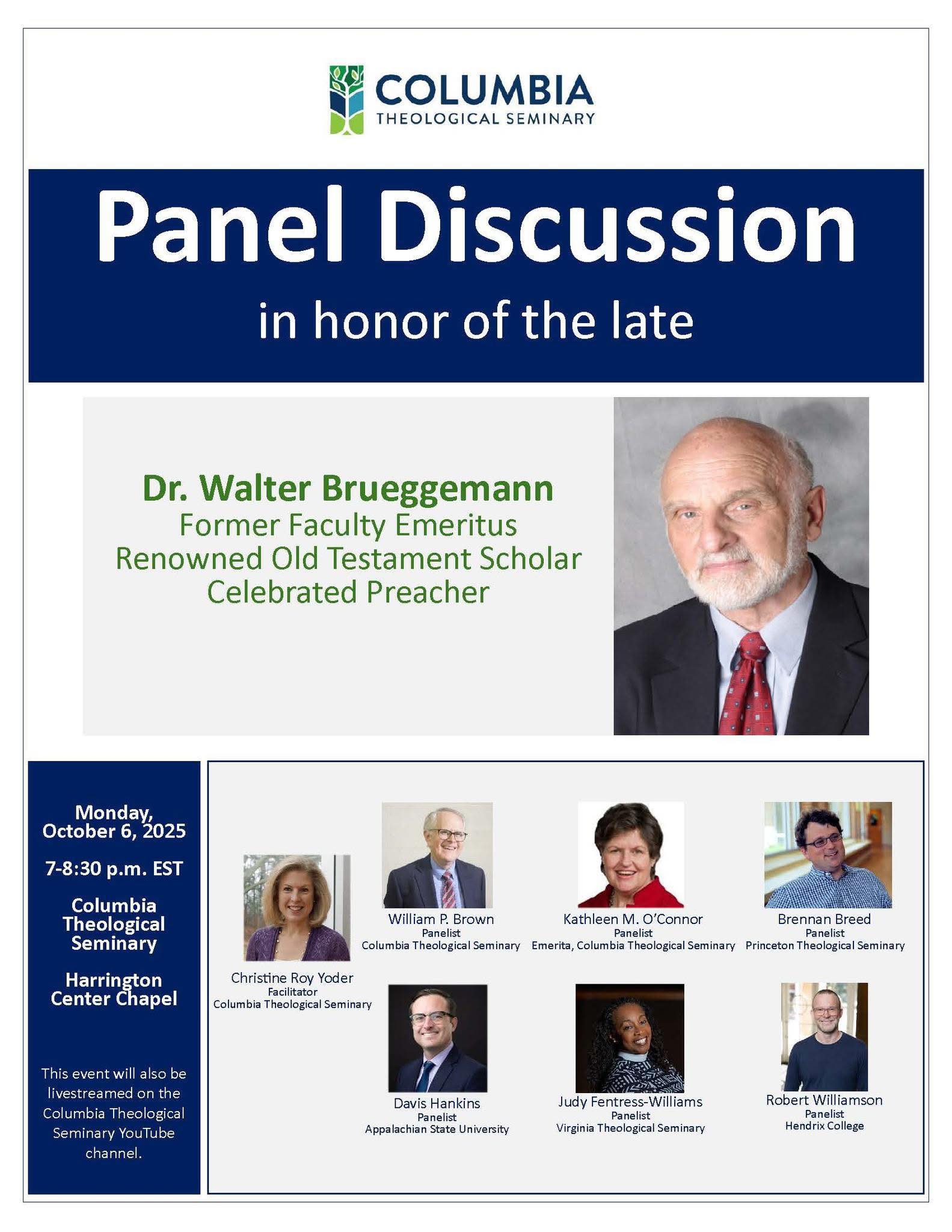 As a new student in Practical Theology, I always look forward to opportunities to attend scholarly gatherings at Columbia Theological Seminary (CTS). On Monday, October 9th, 2025, I joined one such gathering, a Panel Discussion in Honor of the late Dr. Walter Brueggemann, one of the most influential Old Testament scholars of our time. The panel was facilitated by Christine Roy Yoder, with distinguished contributions from William P. Brown (CTS), Brennan Breed (Princeton Theological Seminary), Davis Hankins (Appalachian State University), Kathleen M. O’Connor (Emerita, CTS), Judy Fentress-Williams (Virginia Theological Seminary), and Robert Williamson (Hendrix College).